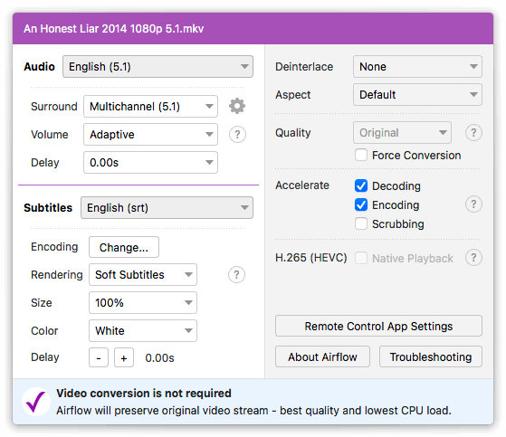 And for those pesky videos that are incompatible with your device - Airflow will handle that tranparently, with hardware accelerated transcoding if your computer supports it.